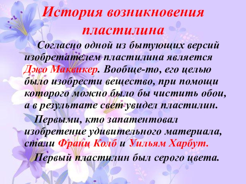 изобретателем пластилина является Джо Маквикер. Вообще-то, его целью было изобрести вещество, при помощи которого можно было бы чистить обои, а в результате свет увидел пластилин.