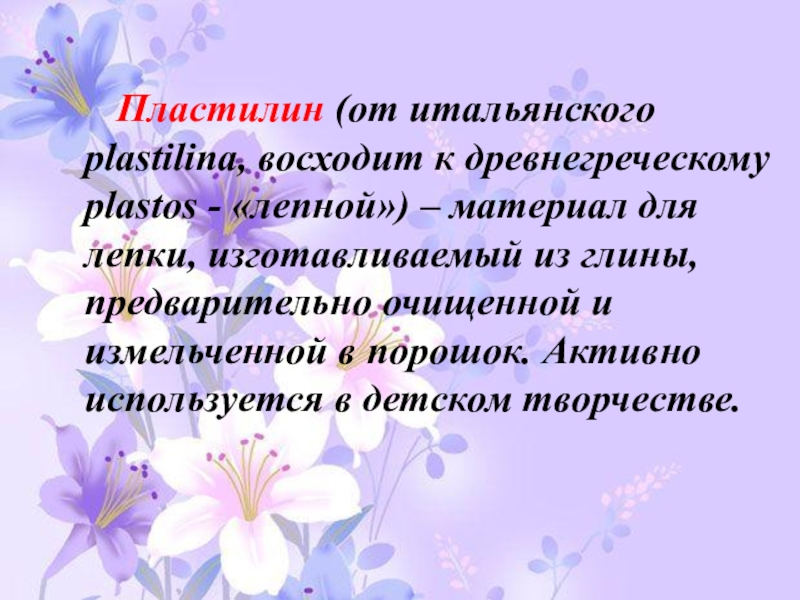 Слайд 4 Пластилин (от итальянского plastilina, восходит к древнегреческому plastos