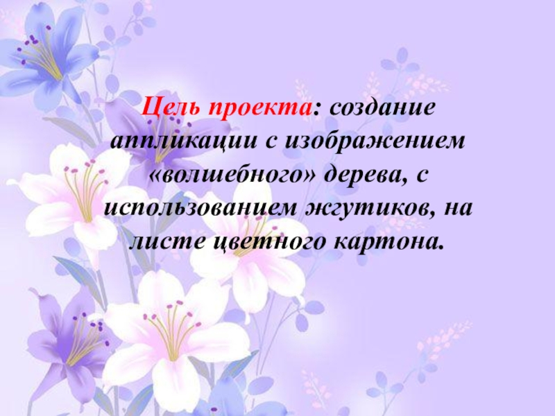 Слайд 2Цель проекта: создание аппликации с изображением «волшебного» дерева, с использованием жгутиков,
