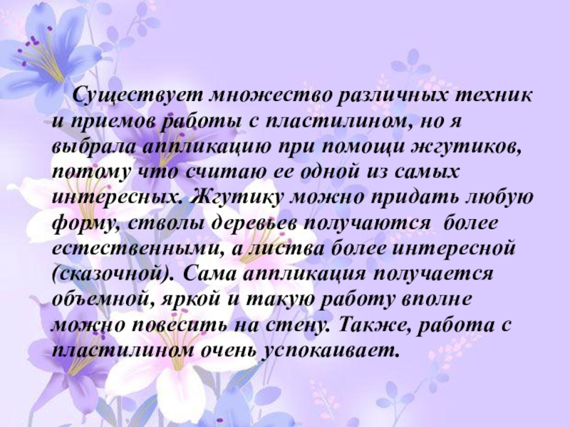 с пластилином, но я выбрала аппликацию при помощи жгутиков, потому что считаю ее одной из самых интересных. Жгутику можно придать любую форму, стволы деревьев получаются более естественными, а листва более интересной (сказочной). Сама аппликация получается объемной, яркой и такую работу вполне можно повесить на стену. Также, работа с пластилином очень успокаивает.