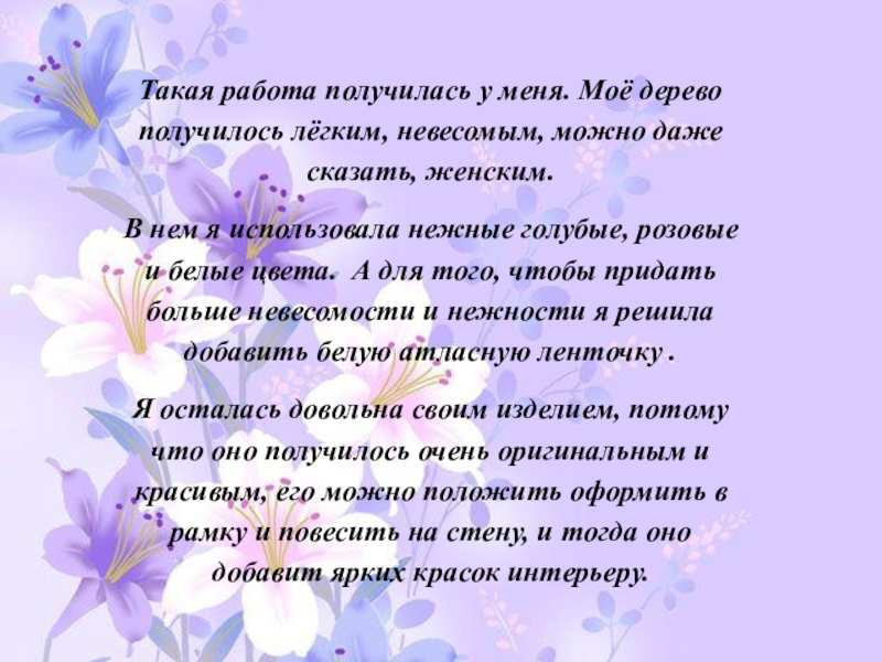 Слайд 19Такая работа получилась у меня. Моё дерево получилось лёгким, невесомым, можно