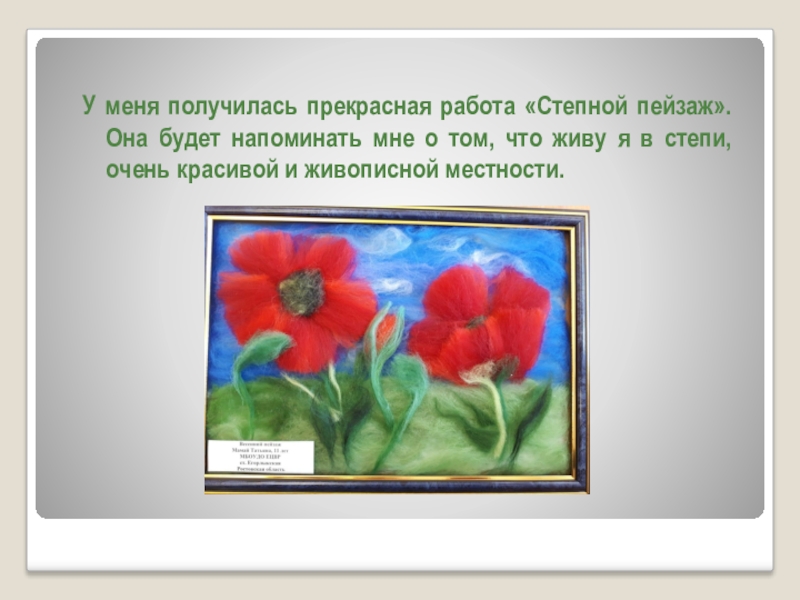 Слайд 14У меня получилась прекрасная работа «Степной пейзаж». Она будет напоминать мне