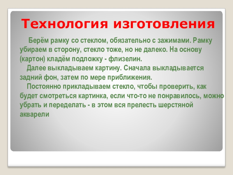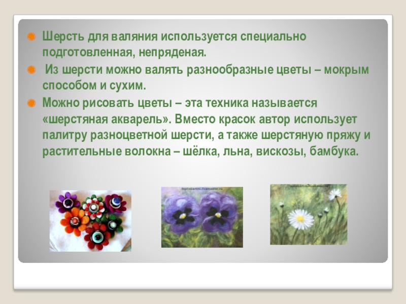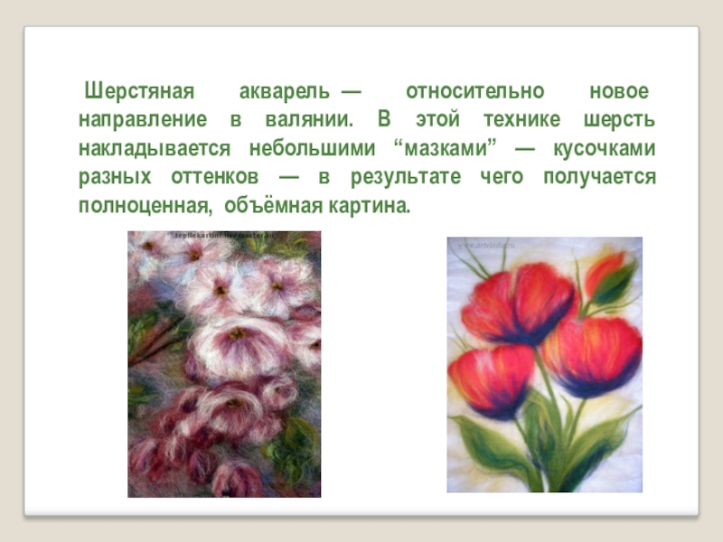 Слайд 8 Шерстяная акварель — относительно новое направление в валянии. В этой технике шерсть