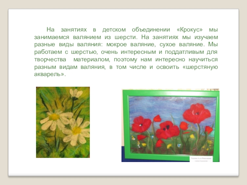 Слайд 4 На занятиях в детском объединении «Крокус» мы занимаемся валянием из шерсти.