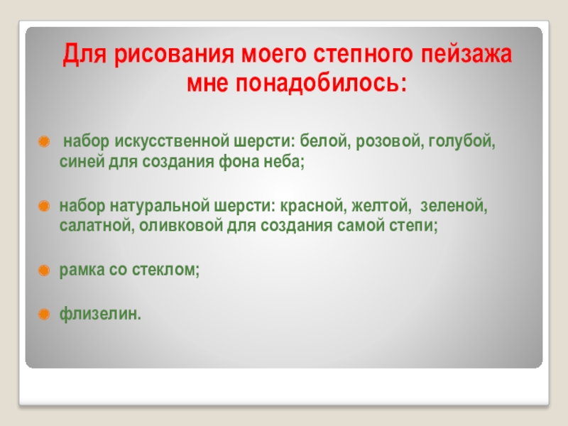 Слайд 11Для рисования моего степного пейзажа мне понадобилось: