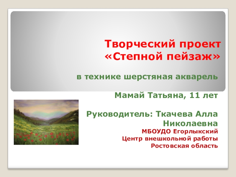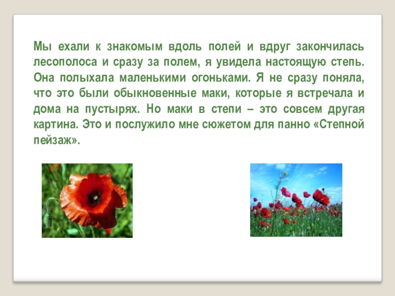 сразу за полем, я увидела настоящую степь. Она полыхала маленькими огоньками. Я не сразу поняла, что это были обыкновенные маки, которые я встречала и дома на пустырях. Но маки в степи – это совсем другая картина. Это и послужило мне сюжетом для панно «Степной пейзаж».