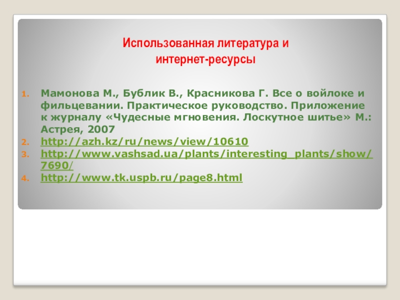 войлоке и фильцевании. Практическое руководство. Приложение к журналу «Чудесные мгновения. Лоскутное шитье» М.:Астрея, 2007