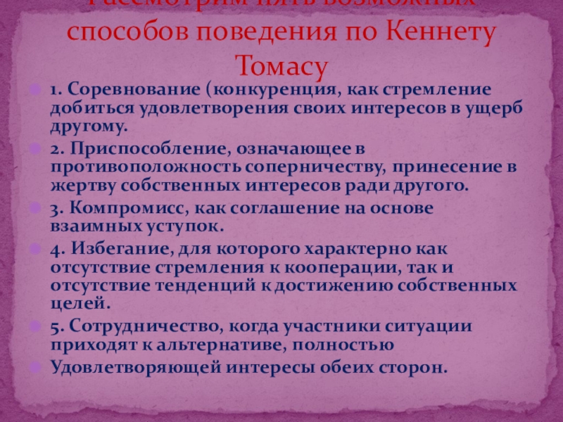 Рассмотрим пять возможных способов поведения по Кеннету Томасу