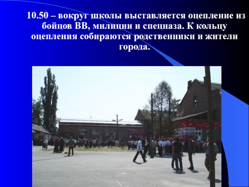 Слайд 5 10.50 – вокруг школы выставляется оцепление из бойцов ВВ, милиции и