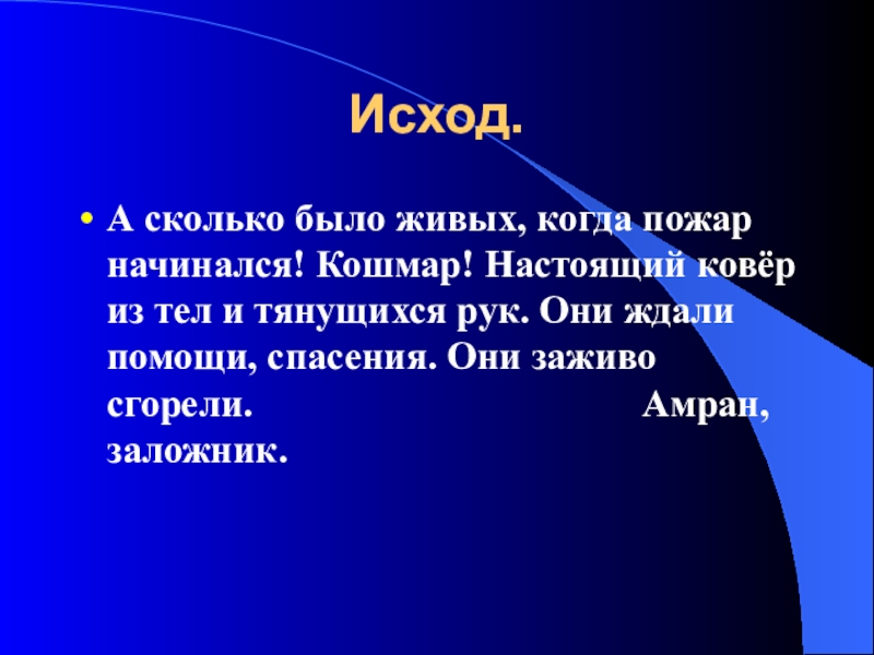 тел и тянущихся рук. Они ждали помощи, спасения. Они заживо сгорели. Амран, заложник.