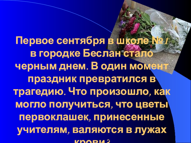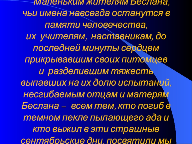 до последней минуты сердцем прикрывавшим своих питомцев и разделившим тяжесть выпавших на их долю испытаний, несгибаемым отцам и матерям Беслана – всем тем, кто погиб в темном пекле пылающего ада и кто выжил в эти страшные сентябрьские дни, посвятили мы наш классный час…