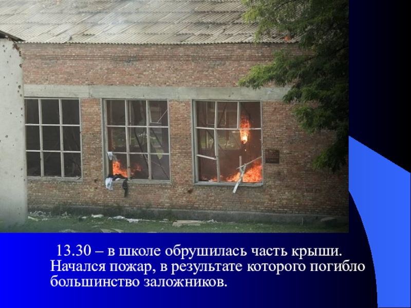 Слайд 15 13.30 – в школе обрушилась часть крыши. Начался пожар, в результате