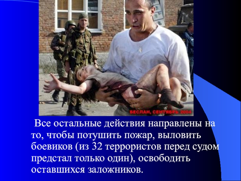 Слайд 17 Все остальные действия направлены на то, чтобы потушить пожар, выловить боевиков