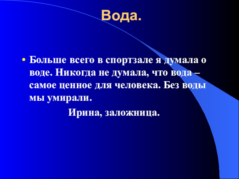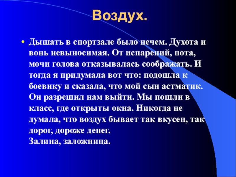 пота, мочи голова отказывалась соображать. И тогда я придумала вот что: подошла к боевику и сказала, что мой сын астматик. Он разрешил нам выйти. Мы пошли в класс, где открыты окна. Никогда не думала, что воздух бывает так вкусен, так дорог, дороже денег. Залина, заложница.