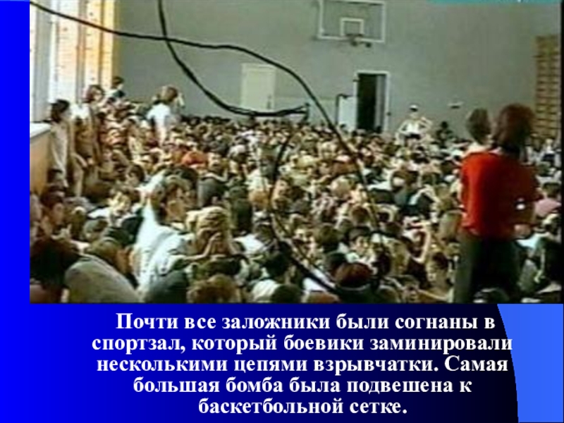 Слайд 7 Почти все заложники были согнаны в спортзал, который боевики заминировали несколькими