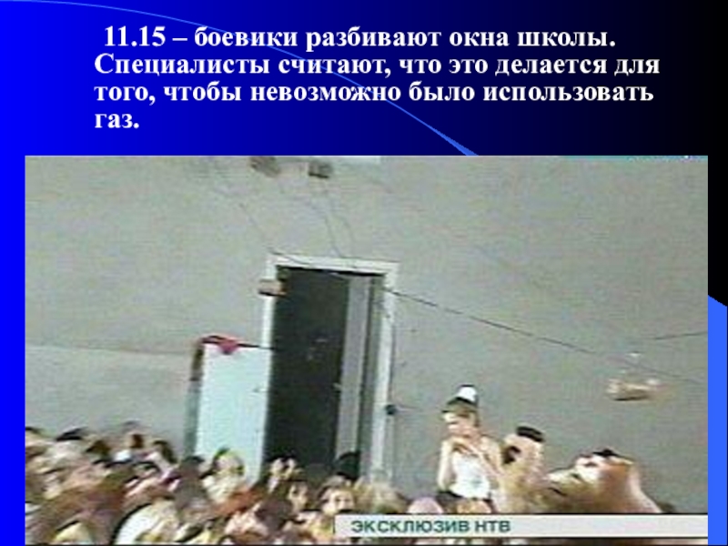 Слайд 8 11.15 – боевики разбивают окна школы. Специалисты считают, что это делается