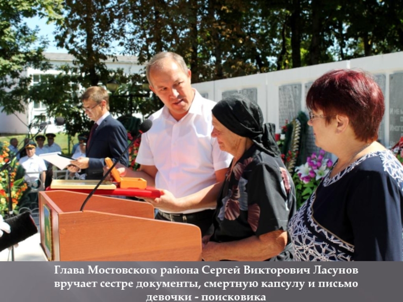 Слайд 8Глава Мостовского района Сергей Викторович Ласунов вручает сестре документы, смертную капсулу