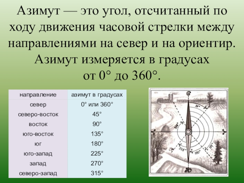 Азимут — это угол, отсчитанный по ходу движения часовой стрелки между направлениями на север и на ориентир. Азимут