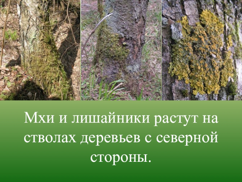 Слайд 7Мхи и лишайники растут на стволах деревьев с северной стороны.