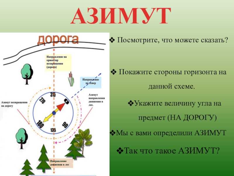 АЗИМУТТак что такое АЗИМУТ? Посмотрите, что можете сказать? Покажите стороны горизонта на данной схеме.Укажите величину угла на