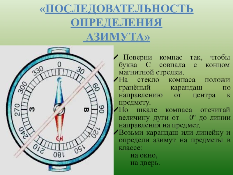 На стекло компаса положи гранёный карандаш по направлению от центра к предмету.