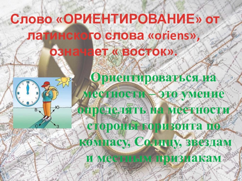 Слово «ОРИЕНТИРОВАНИЕ» от латинского слова «oriens», означает « восток».Ориентироваться на местности – это умение определять на местности стороны горизонта по компасу, Солнцу, звездам и местным признакам