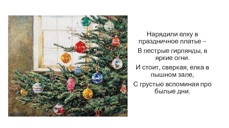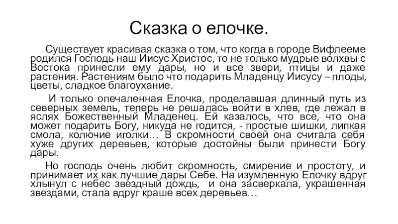 И только опечаленная Елочка, проделавшая длинный путь из северных земель, теперь не решалась войти в хлев, где лежал в яслях Божественный Младенец. Ей казалось, что все, что она может подарить Богу, никуда не годится, - простые шишки, липкая смола, колючие иголки… В скромности своей она считала себя хуже других деревьев, которые достойны были принести Богу дары.
