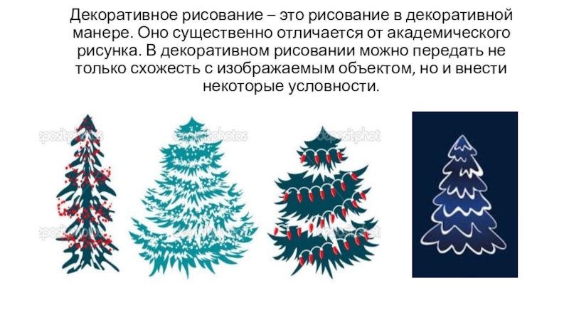 Слайд 10Декоративное рисование – это рисование в декоративной манере. Оно существенно отличается