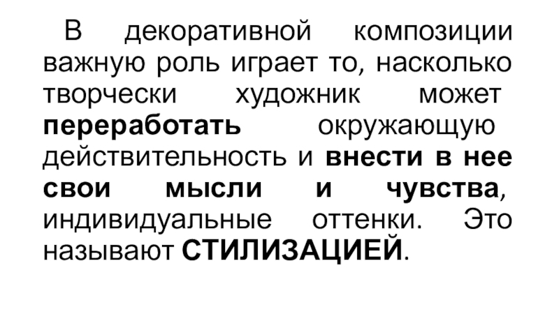 переработать окружающую действительность и внести в нее свои мысли и чувства, индивидуальные оттенки. Это называют СТИЛИЗАЦИЕЙ.