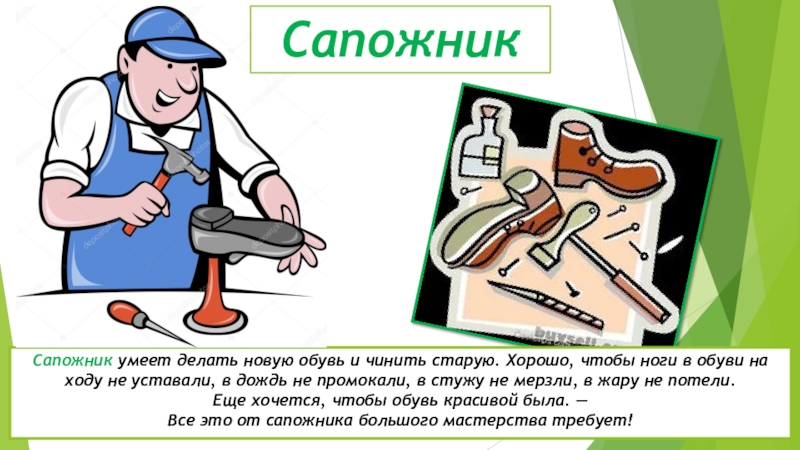 Слайд 22Сапожник умеет делать новую обувь и чинить старую. Хорошо, чтобы ноги