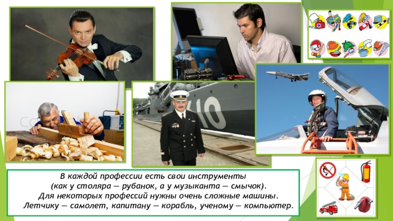 (как у столяра — рубанок, а у музыканта — смычок). Для некоторых профессий нужны очень сложные машины. Летчику — самолет, капитану — корабль, ученому — компьютер.