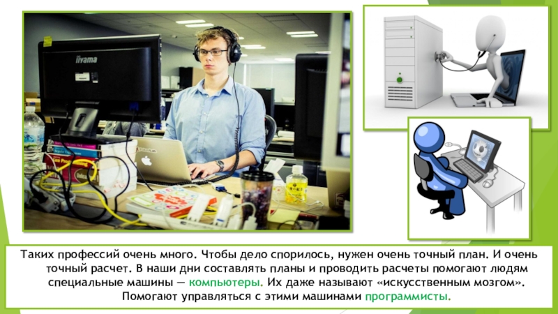 И очень точный расчет. В наши дни составлять планы и проводить расчеты помогают людям специальные машины — компьютеры. Их даже называют «искусственным мозгом». Помогают управляться с этими машинами программисты.