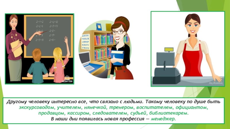 душе быть экскурсоводом, учителем, нянечкой, тренером, воспитателем, официантом, продавцом, кассиром, следователем, судьей, библиотекарем. В наши дни появилась новая профессия — менеджер.