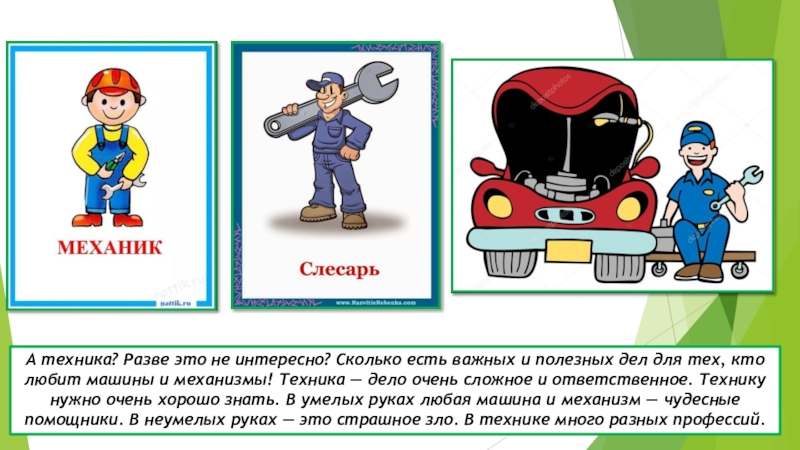 дел для тех, кто любит машины и механизмы! Техника — дело очень сложное и ответственное. Технику нужно очень хорошо знать. В умелых руках любая машина и механизм — чудесные помощники. В неумелых руках — это страшное зло. В технике много разных профессий.