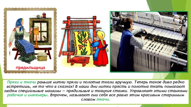 Слайд 28Пряхи и ткачи раньше нитки пряли и полотна ткали вручную. Теперь