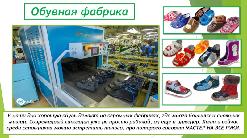 Слайд 23В наши дни хорошую обувь делают на огромных фабриках, где много