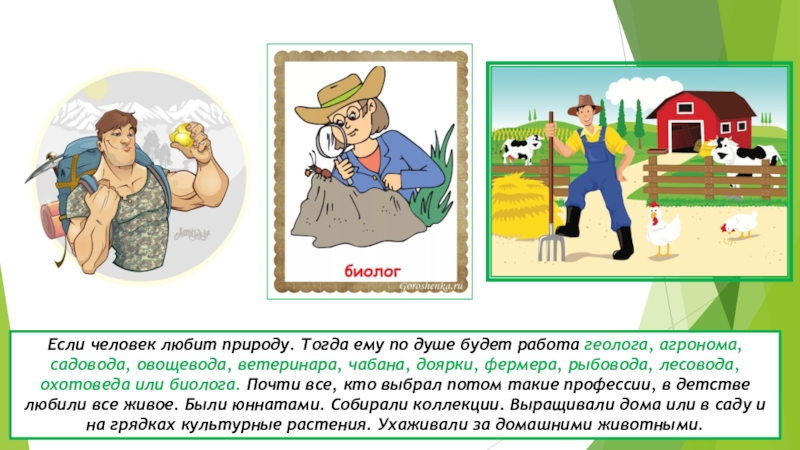 агронома, садовода, овощевода, ветеринара, чабана, доярки, фермера, рыбовода, лесовода, охотоведа или биолога. Почти все, кто выбрал потом такие профессии, в детстве любили все живое. Были юннатами. Собирали коллекции. Выращивали дома или в саду и на грядках культурные растения. Ухаживали за домашними животными.