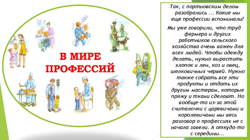 Мы уже говорили, что труд фермера и других работников сельского хозяйства очень важен для всех людей. Чтобы одежду делать, нужно вырастить хлопок и лен, коз и овец, шелковичных червей. Нужно также собрать все эти продукты и отдать их другим мастерам, которые пряжу и ткани сделают. Но вообще-то из-за этой считалочки с царевичами и королевичами мы весь разговор о профессиях не с начала завели. А откуда-то с середины...