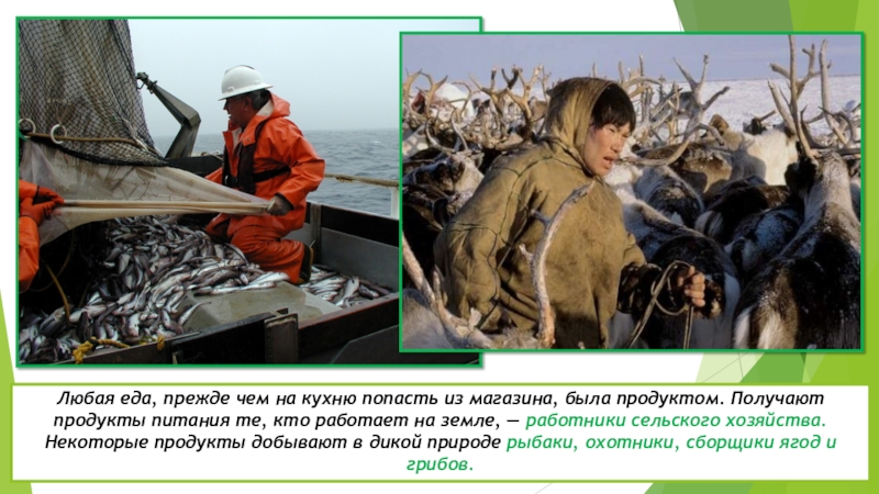 Получают продукты питания те, кто работает на земле, — работники сельского хозяйства. Некоторые продукты добывают в дикой природе рыбаки, охотники, сборщики ягод и грибов.