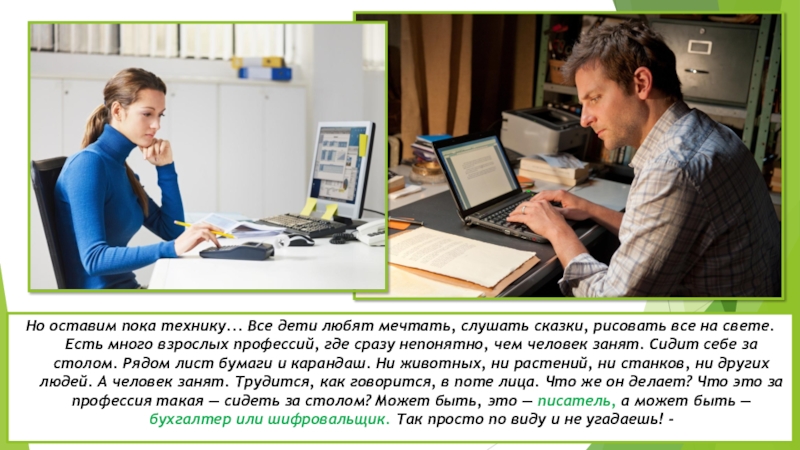 все на свете. Есть много взрослых профессий, где сразу непонятно, чем человек занят. Сидит себе за столом. Рядом лист бумаги и карандаш. Ни животных, ни растений, ни станков, ни других людей. А человек занят. Трудится, как говорится, в поте лица. Что же он делает? Что это за профессия такая — сидеть за столом? Может быть, это — писатель, а может быть — бухгалтер или шифровальщик. Так просто по виду и не угадаешь! -