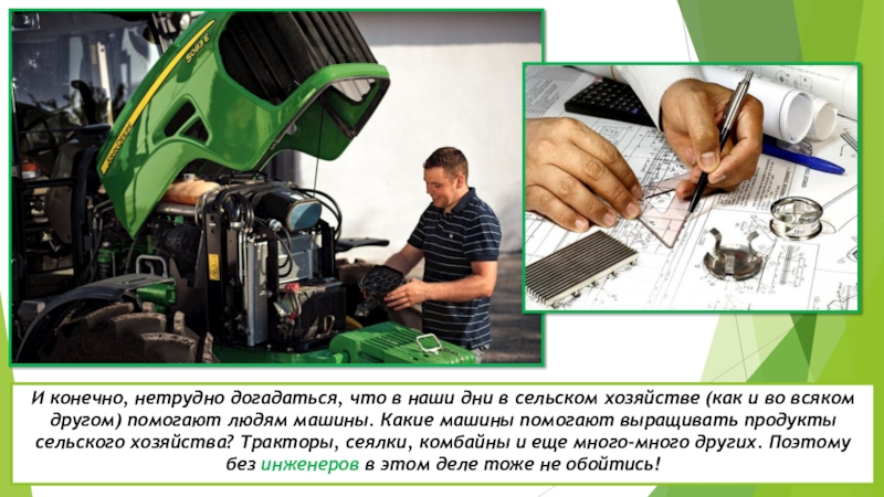 (как и во всяком другом) помогают людям машины. Какие машины помогают выращивать продукты сельского хозяйства? Тракторы, сеялки, комбайны и еще много-много других. Поэтому без инженеров в этом деле тоже не обойтись!