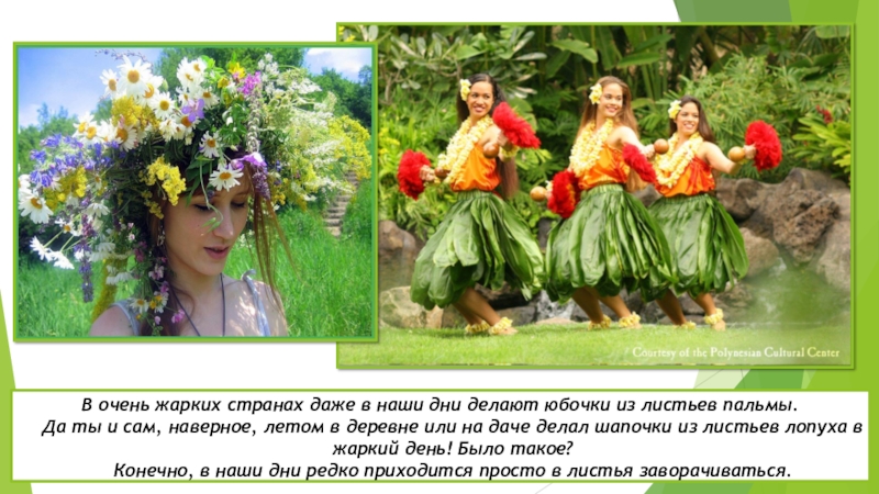 листьев пальмы. Да ты и сам, наверное, летом в деревне или на даче делал шапочки из листьев лопуха в жаркий день! Было такое? Конечно, в наши дни редко приходится просто в листья заворачиваться.