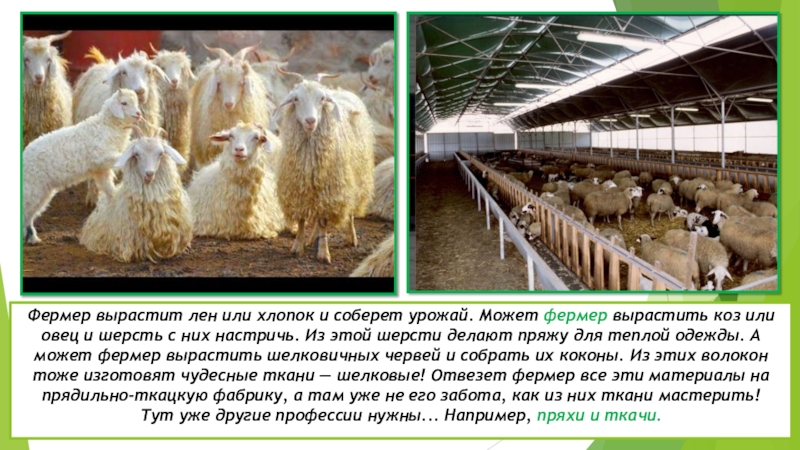 коз или овец и шерсть с них настричь. Из этой шерсти делают пряжу для теплой одежды. А может фермер вырастить шелковичных червей и собрать их коконы. Из этих волокон тоже изготовят чудесные ткани — шелковые! Отвезет фермер все эти материалы на прядильно-ткацкую фабрику, а там уже не его забота, как из них ткани мастерить! Тут уже другие профессии нужны... Например, пряхи и ткачи.