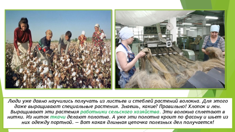 Для этого даже выращивают специальные растения. Знаешь, какие? Правильно! Хлопок и лен. Выращивают эти растения работники сельского хозяйства. Эти волокна сплетают в нитки. Из ниток ткачи делают полотна. А уже эти полотна кроит по фасону и шьет из них одежду портной. — Вот какая длинная цепочка полезных дел получается!