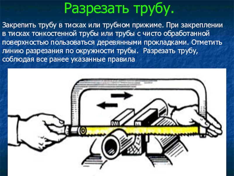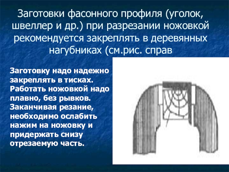 Заканчивая резание, необходимо ослабить нажим на ножовку и придержать снизу отрезаемую часть.