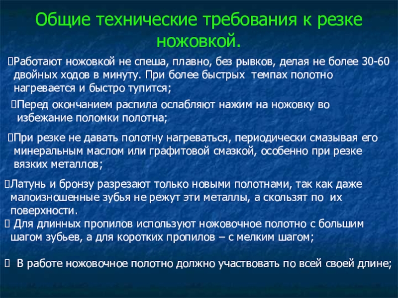 В работе ножовочное полотно должно участвовать по всей своей длине;