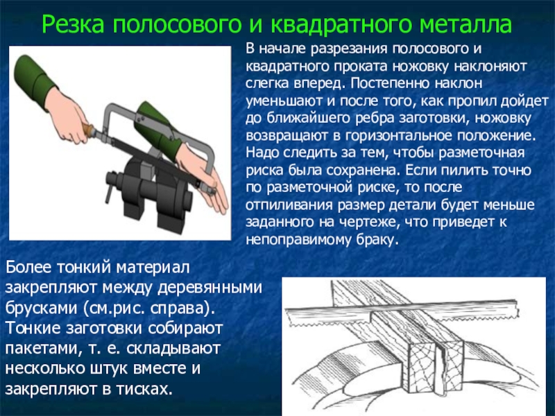 В начале разрезания полосового и квадратного проката ножовку наклоняют слегка вперед. Постепенно наклон уменьшают и после того, как пропил дойдет до ближайшего ребра заготовки, ножовку возвращают в горизонтальное положение.