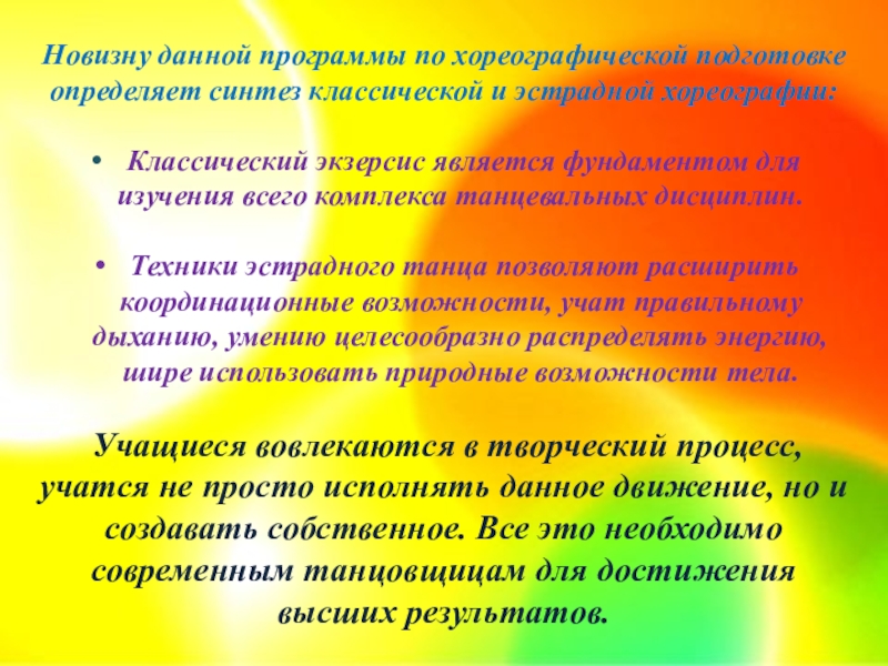 Слайд 7Новизну данной программы по хореографической подготовке определяет синтез классической и эстрадной