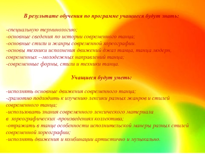 -отражать в танце особенности исполнительской манеры разных стилей современной хореографии;