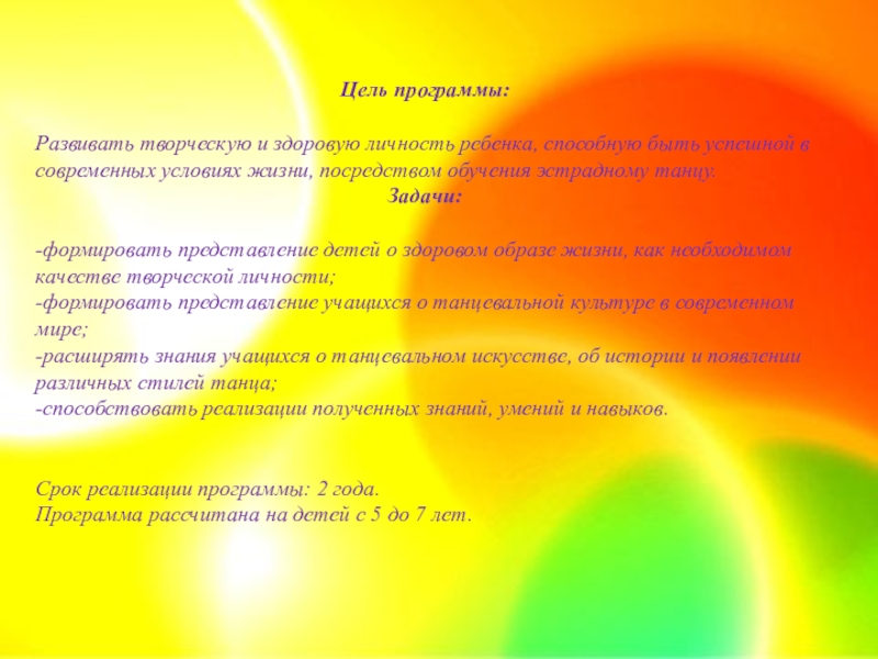 Одно из важных мест в хореографии занимают такие виды искусства как современная пластика и музыка. Музыкальное сопровождение развивает музыкальный вкус, чувство ритма, согласованность движений с музыкой. Пластика учит красиво двигаться, развивает двигательные способности детей. Хореография учит соблюдать правила эстетического поведения, формирует понятие о красоте тела и гармонии, развивает чувство прекрасного. Развивающие занятия по данной программе представляют собой свободное передвижение по площадке, включающее в себя элементы танца, пластики, мимики, пантомимики, ритмически согласованных с музыкой движений без предмета и с предметами.